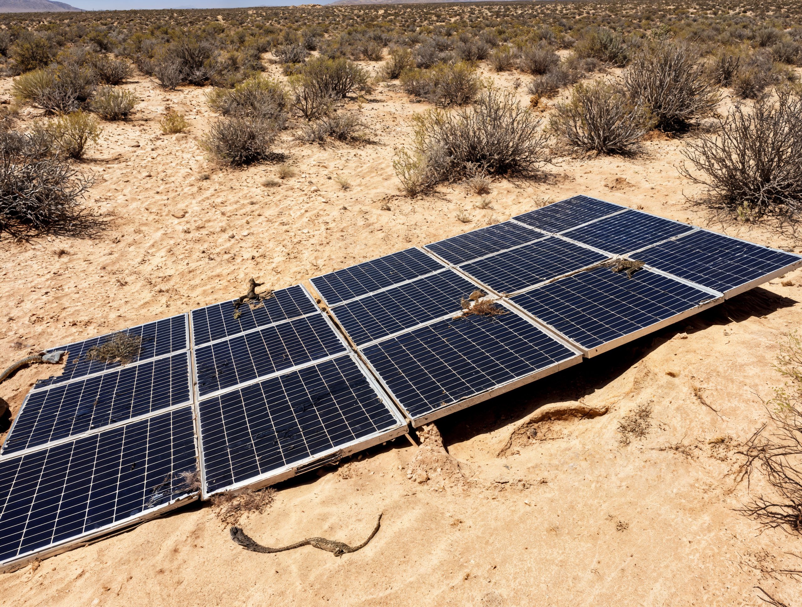 copyBroken solar panel in the middle of the desert in the morning with tumble weeds around